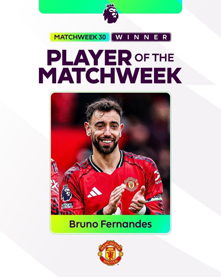 直播吧3月18日訊 英超官方消息,曼聯(lián)中場(chǎng)B費(fèi)當(dāng)選聯(lián)賽第30輪最佳球員。