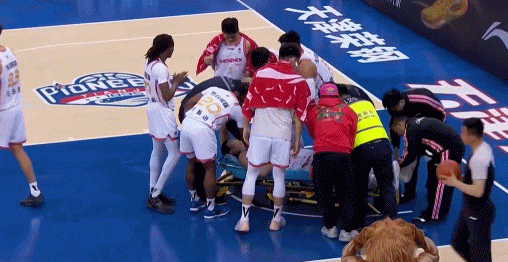 本場比賽,深圳男籃球員馮熙瑞在防守時空中對抗后重摔在地,隨后被擔架直接抬走。
