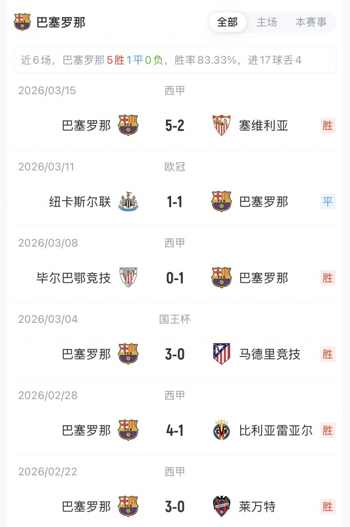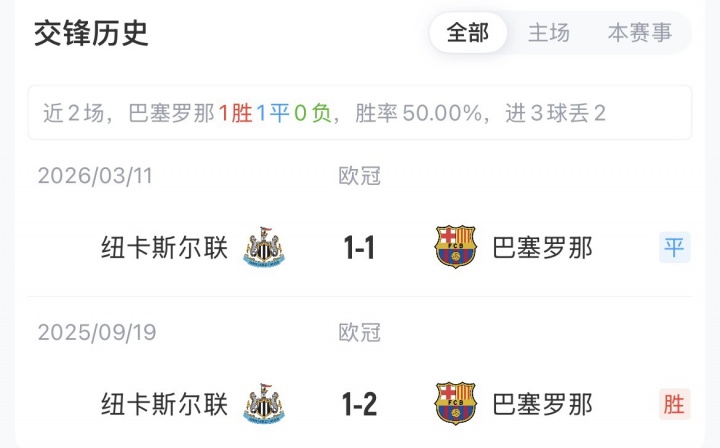 巴薩首回合客場1-1紐卡,本場的勝者將對陣馬競與熱刺的勝者。