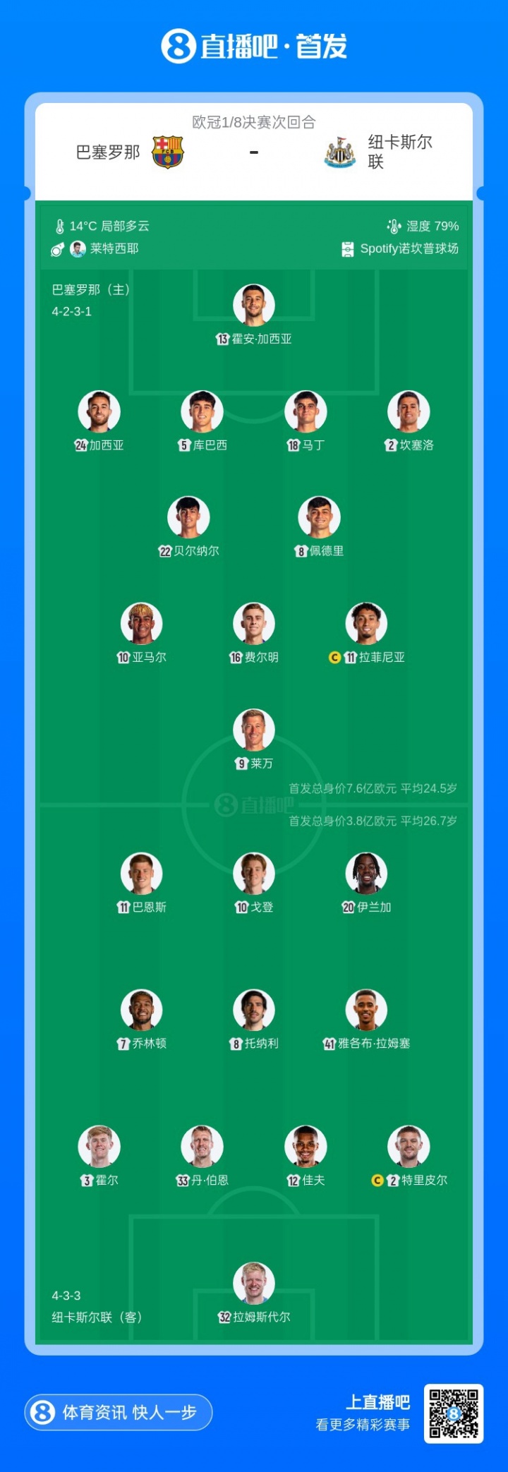 巴薩vs紐卡首發(fā):亞馬爾領(lǐng)銜,萊萬、拉菲尼亞、貝爾納爾先發(fā)
