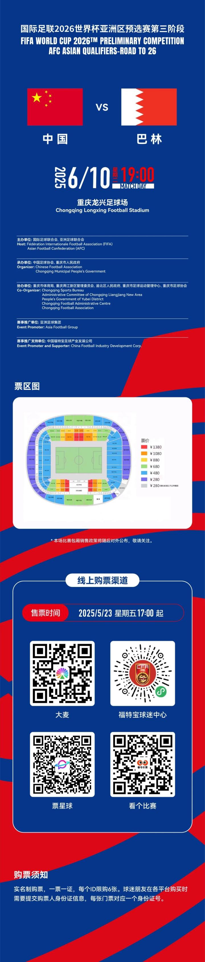 據官方消息,國足18強賽最后一個主場對陣巴林的球票將于5月23日17:00開始銷售。