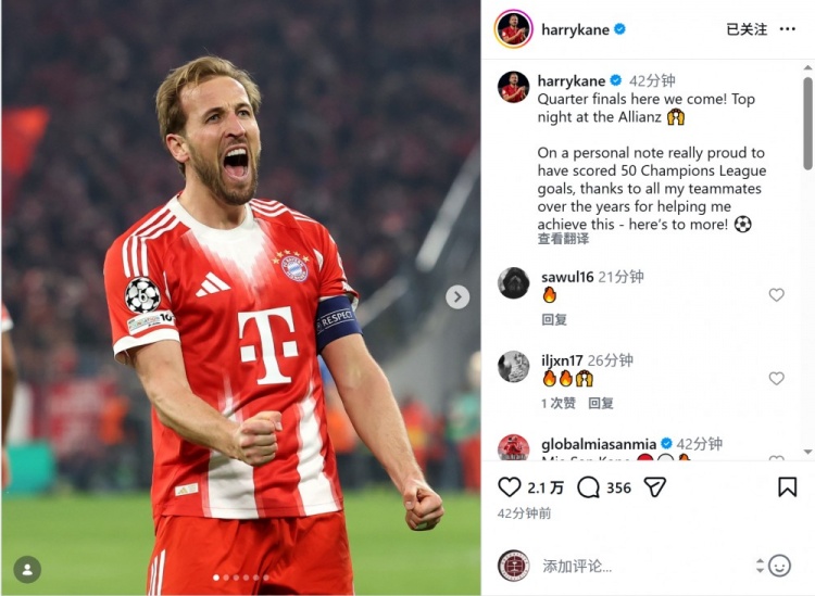 凱恩社媒曬出慶祝進(jìn)球的照片,配文:“四分之一決賽,我們來了!安聯(lián)球場(chǎng)的精彩夜晚!”