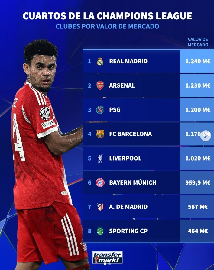 直播吧3月19日訊 本賽季歐冠8強(qiáng)全部產(chǎn)生,德轉(zhuǎn)也列出8強(qiáng)球隊(duì)身價(jià)榜,具體如下: