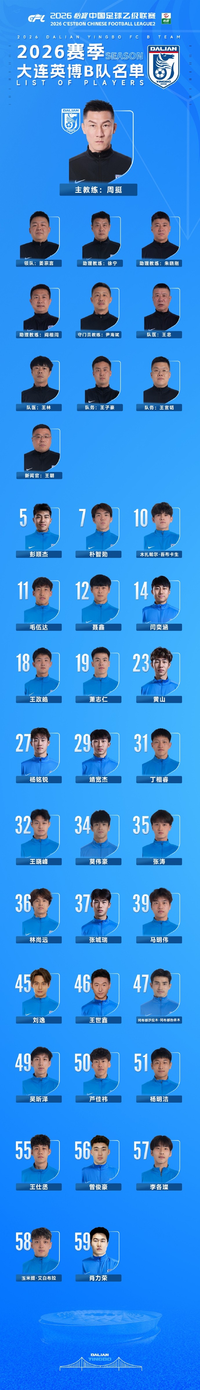 直播吧3月19日訊 新賽季中乙本周末開幕,大連英博B隊(duì)公布名單,周挺主教練閻相闖助教,楊銘銳在列。