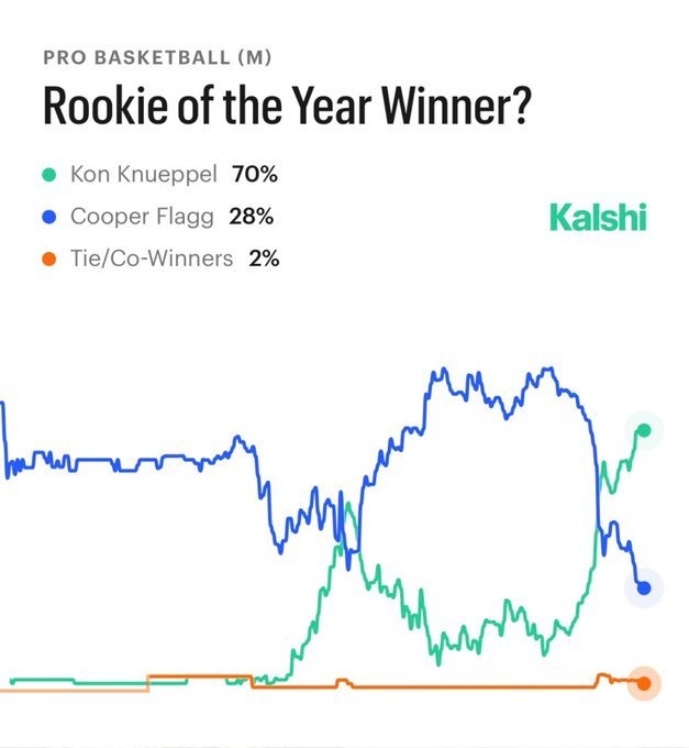 這張圖藍(lán)色代表弗拉格、綠色代表克尼佩爾,橙色代表其他新秀,基本上就是在全明星前后,獲獎(jiǎng)概率發(fā)生了交替,然后隨著弗拉格之前長(zhǎng)期傷缺,而康神越來(lái)越厲害,黃蜂又一波連勝,看起來(lái)ROY已經(jīng)沒(méi)啥懸念了。