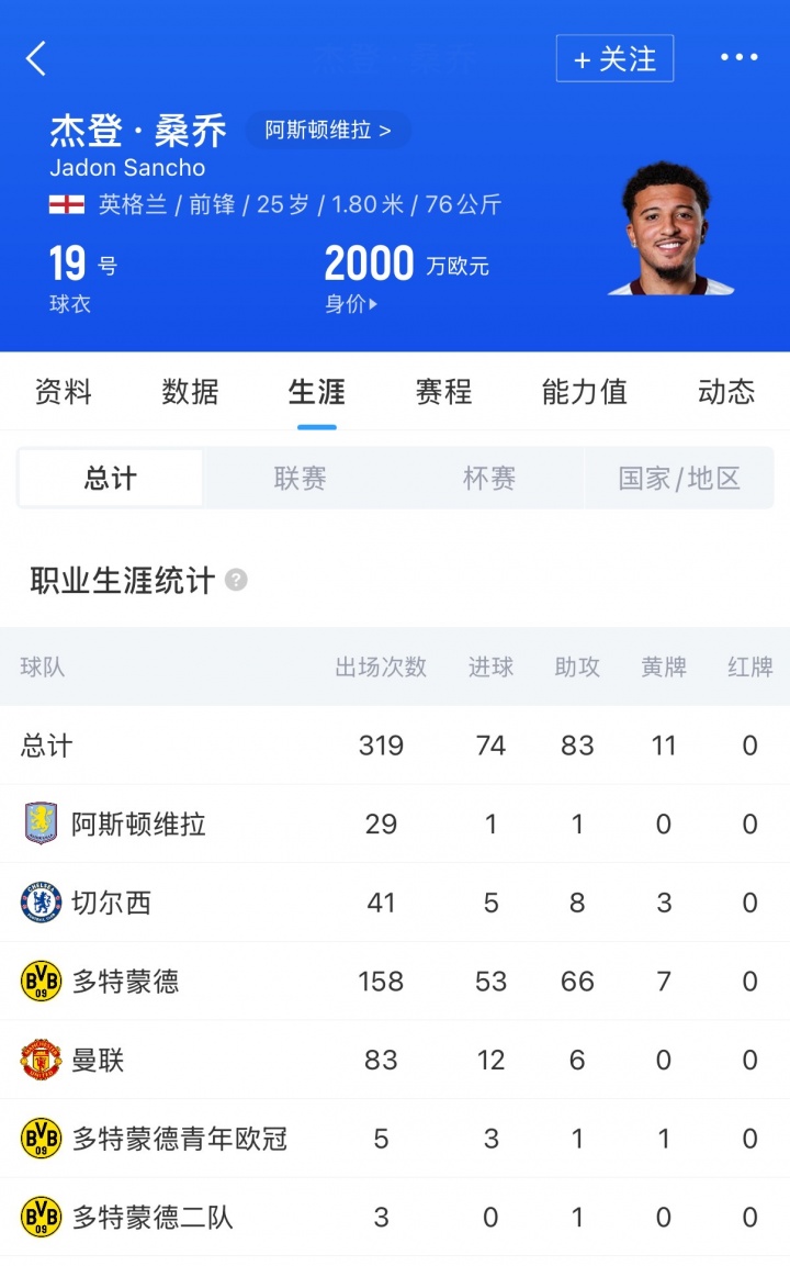 在2021年夏天,桑喬以8500萬歐元轉(zhuǎn)會費從多特加盟曼聯(lián)。桑喬至今為曼聯(lián)總計出場83次,貢獻12球6助,但他近兩個賽季均被外租。目前球員德轉(zhuǎn)身價為2000萬歐元。