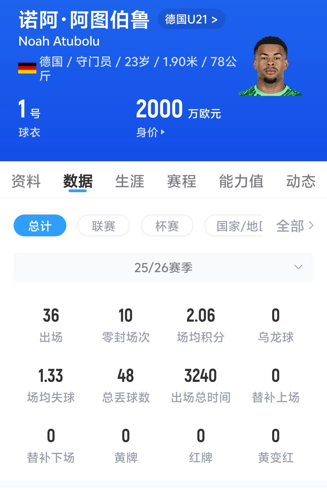 阿圖伯魯去年十月份入選了德國國家隊(duì),本賽季代表弗賴堡出場36次丟球48粒,零封10次。當(dāng)前身價2000萬歐元。