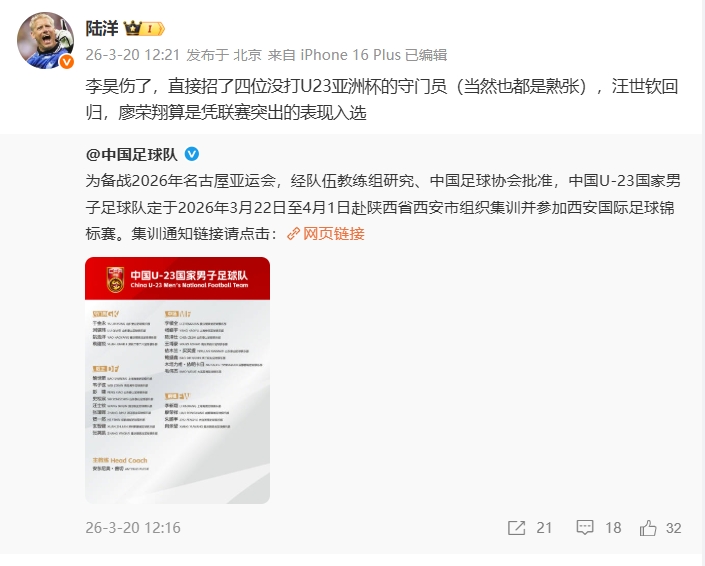 媒體人陸洋寫道:李昊傷了,直接招了四位沒打U23亞洲杯的守門員(當然也都是熟張),汪士欽回歸,廖榮翔算是憑聯(lián)賽突出的表現(xiàn)入選