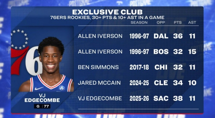 埃奇庫姆單場30+10助隊史新秀第4人!比肩艾弗森&本西&麥凱恩