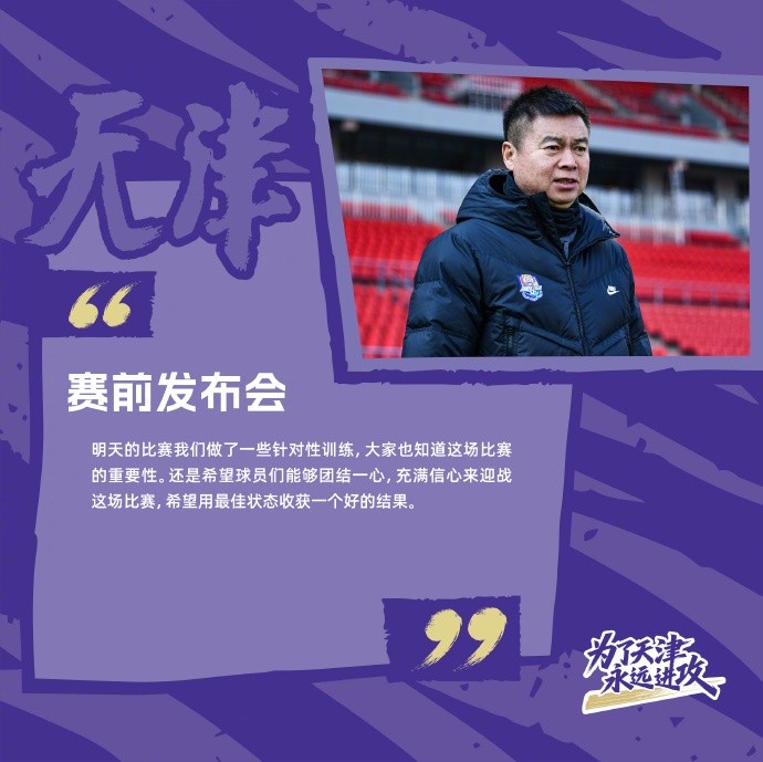 于根偉:明天的比賽我們做了一些針對性訓練,大家也知道這場比賽的重要性。還是希望球員們能夠團結(jié)一心,充滿信心來迎戰(zhàn)這場比賽,希望用最佳狀態(tài)收獲一個好的結(jié)果。