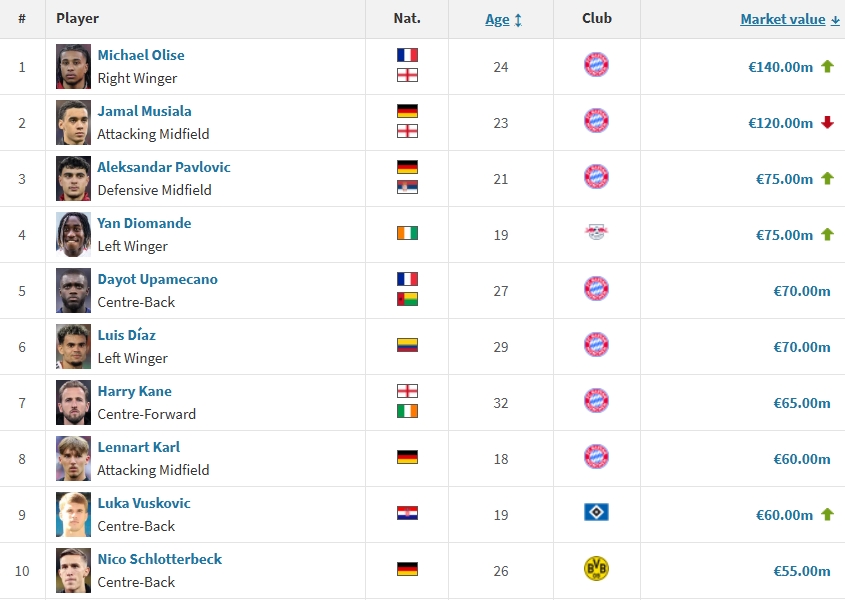 德甲身價更新:奧利塞漲至1.4億!穆西亞拉1.2億帕夫洛維奇7500萬