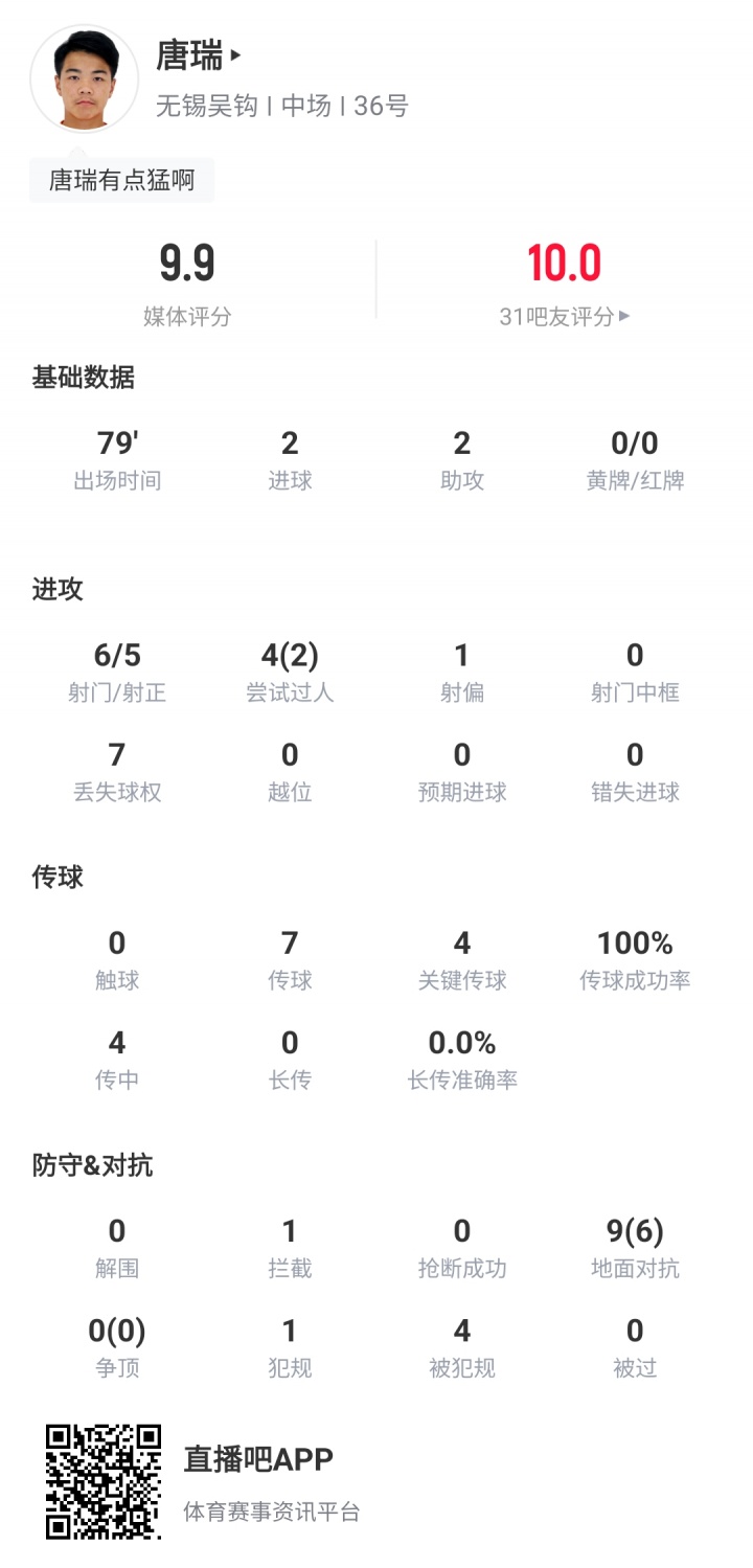 直播吧03月20日訊 中甲第2輪,升班馬無(wú)錫吳鉤4-0大勝深圳青年人,20歲泰山外租小將唐瑞2球2助獨(dú)造4球,前2輪打進(jìn)3球2次助攻,領(lǐng)跑射手榜和助攻榜。