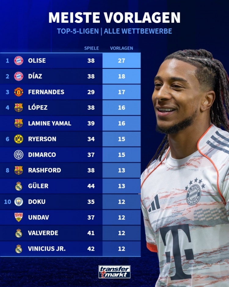 直播吧3月21日訊 德國轉(zhuǎn)會市場統(tǒng)計(jì)了五大聯(lián)賽球員本賽季各賽事的助攻次數(shù),并列出榜單,奧利塞27助斷層居首。