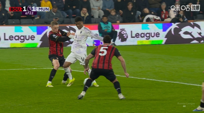 英超第31輪,曼聯(lián)客戰(zhàn)伯恩茅斯。67分鐘,阿瑪?shù)陆麉^(qū)內(nèi)倒地,裁判沒有表示。伯恩茅斯隨后發(fā)動反擊扳平比分。