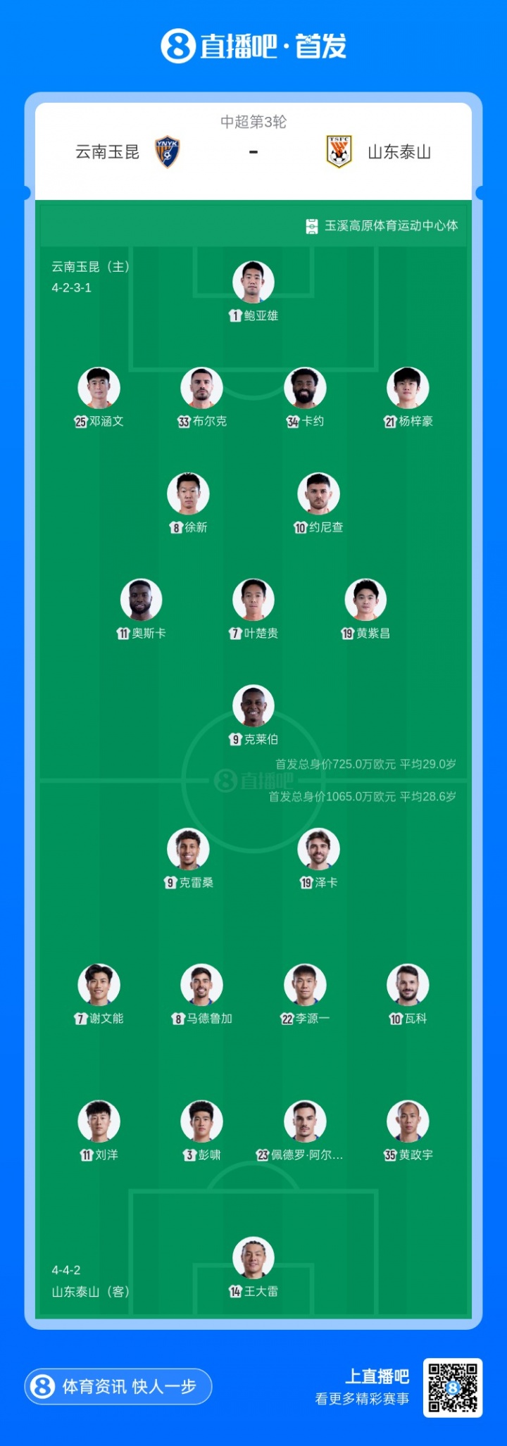 直播吧03月21日訊 北京時(shí)間20點(diǎn),中超第3輪,云南玉昆vs山東泰山,賽前雙方首發(fā)公布!【本場(chǎng)比賽雙方均排出了五外援的陣容,云南玉昆方面奧斯卡、黃紫昌先發(fā),侯永永、布尼亞明替補(bǔ)待命;泰山方面狀態(tài)出色的謝文能繼續(xù)出戰(zhàn),彭嘯、李源一登場(chǎng),高準(zhǔn)翼、李小恒傷缺?!?/strong>