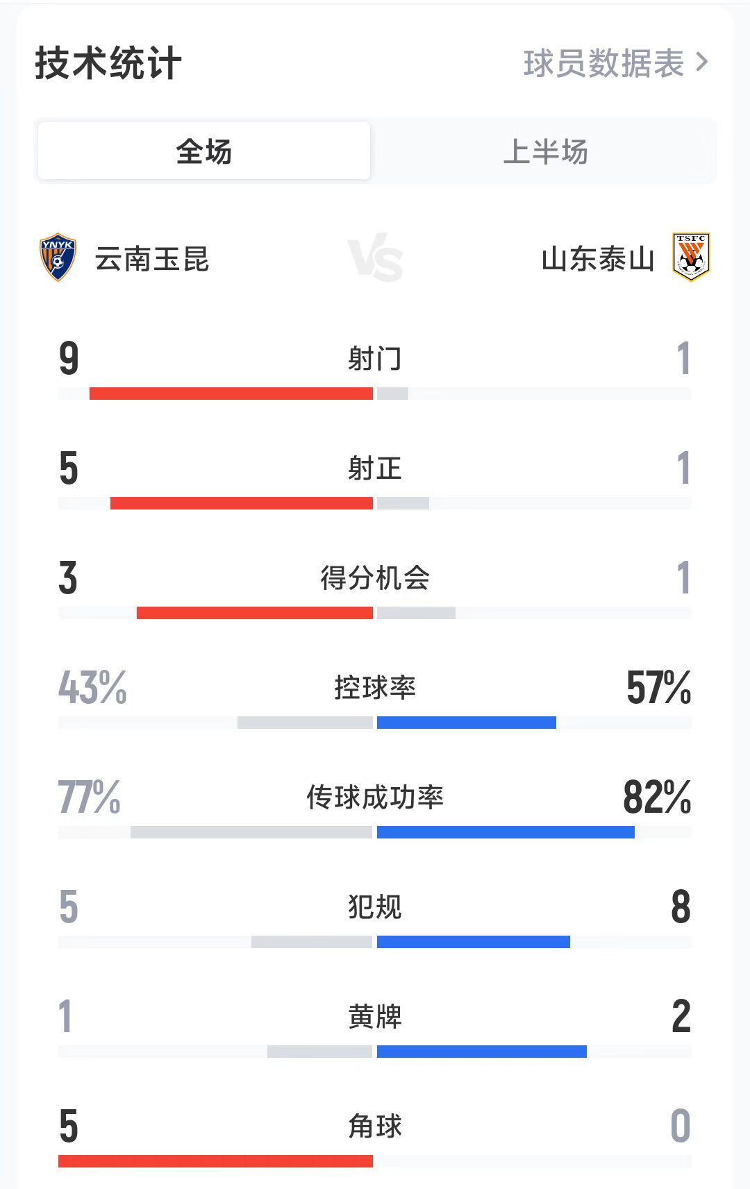 直播吧03月21日訊 中超第3輪,玉昆半場3-0泰山,半場數(shù)據(jù)如下。