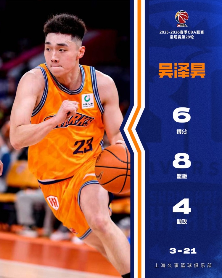 此役,上海隊新秀吳澤昊迎來首秀,他替補登場17分鐘,投籃6中3,三分2中0,得到6分8板4助1斷,正負(fù)值+20。