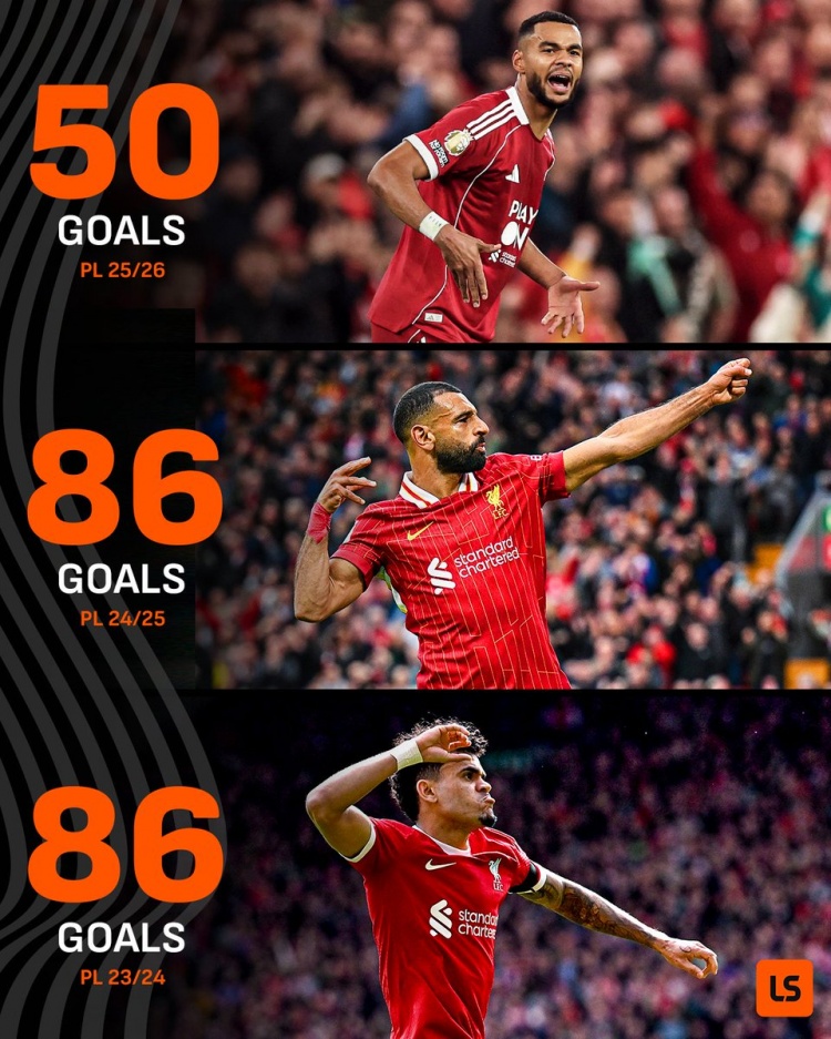 過去兩個(gè)賽季,利物浦38輪聯(lián)賽均打進(jìn)86球。也就是說,剩余的7場聯(lián)賽,即便紅軍每場比賽打進(jìn)5球也無法和過去兩個(gè)賽季的進(jìn)球數(shù)匹敵。
