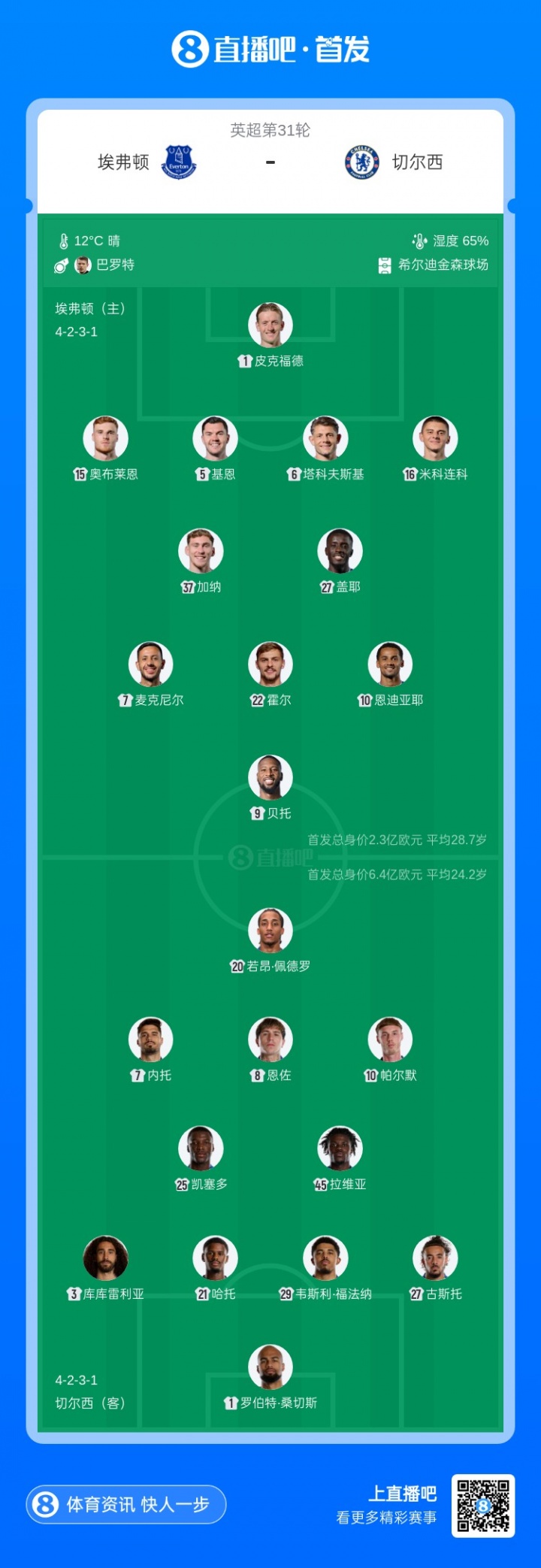 直播吧3月22日訊 北京時(shí)間3月22日凌晨1:30,英超第31輪,埃弗頓vs切爾西。賽前雙方公布了本場比賽的首發(fā)名單?!厩袪栁鞣矫妫材匪箓?,拉維亞搭檔凱塞多組成雙后腰,恩佐位置靠前;三叉戟為若昂·佩德羅、內(nèi)托和帕爾默。】