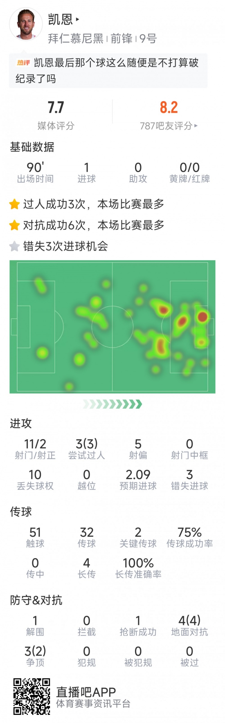 直播吧3月22日訊 在本輪德甲,拜仁4-0大勝柏林聯(lián)合,以下為凱恩本場(chǎng)數(shù)據(jù):