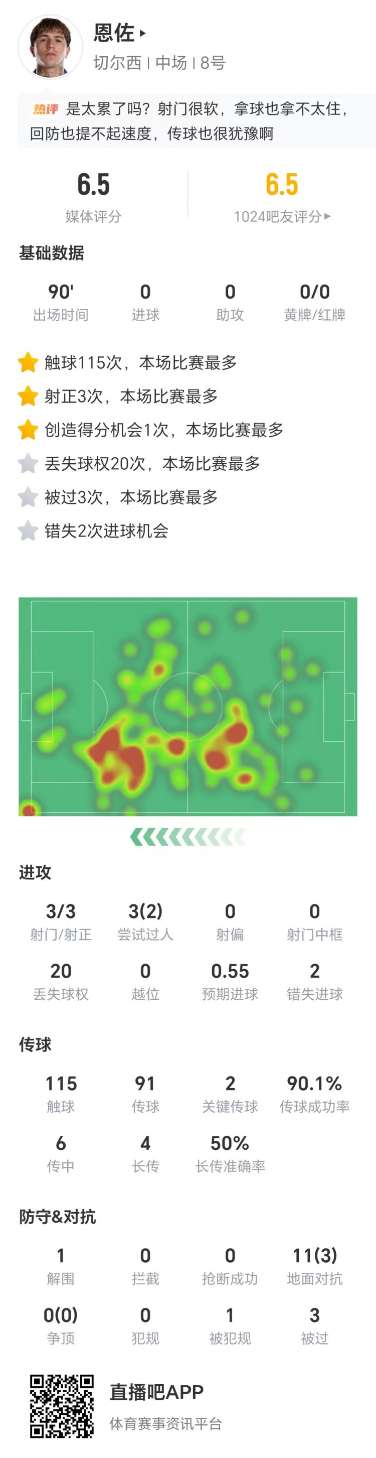 恩佐數(shù)據(jù):3射3正,兩次錯(cuò)失進(jìn)球,兩次關(guān)鍵傳球,獲評6.5分