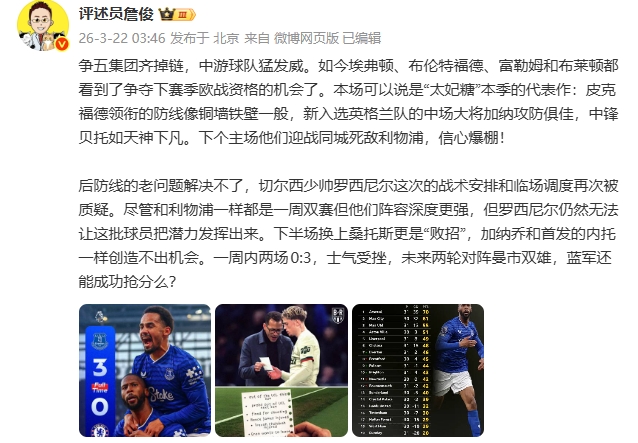 直播吧03月22日訊 本輪英超,利物浦、切爾西雙雙輸球,詹俊發(fā)文點(diǎn)評(píng)了今天的比賽。