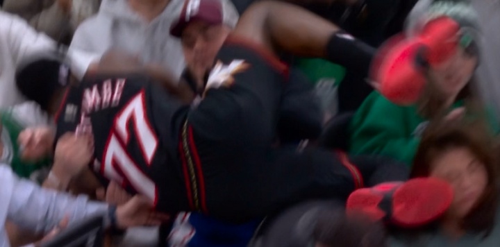 GIF-埃奇庫(kù)姆救球不小心踢到女球迷 后者直接掛彩 VJ趕緊來(lái)抱抱安慰下