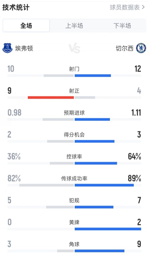 埃弗頓3-0切爾西全場數(shù)據(jù):射門10-12,射正9-4,控球率36%-64%