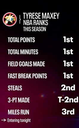 76人客場挑戰(zhàn)綠軍,轉(zhuǎn)播方給出馬克西數(shù)據(jù),多項排名聯(lián)盟第一: