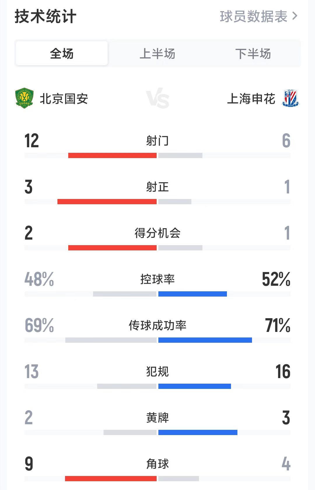 直播吧03月21日訊 中超第3輪,北京國安1-1主場戰(zhàn)平上海申花,全場數(shù)據(jù)如下。