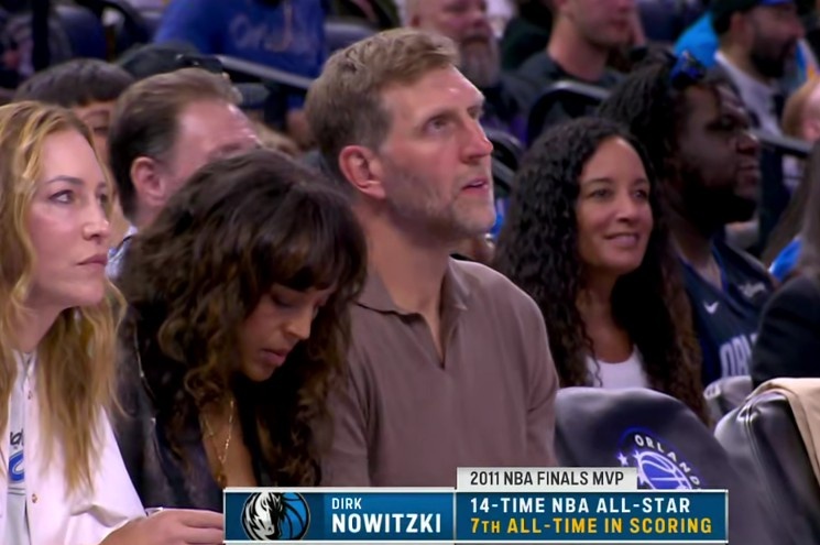 鏡頭捕捉到,獨(dú)行俠名宿諾維茨基來到現(xiàn)場觀看比賽。
