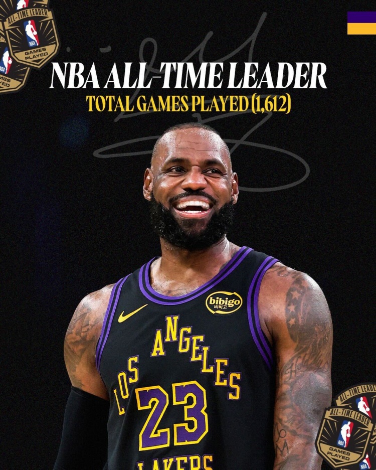 加上本場比賽,詹姆斯的生涯總出場數(shù)來到了1612場,超越羅伯特·帕里什,獨占NBA歷史第一。