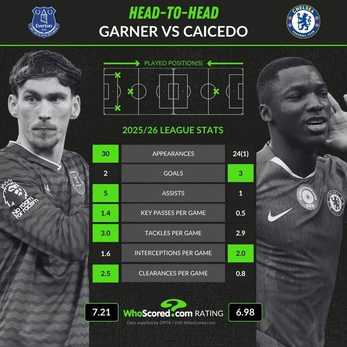 直播吧3月22日訊 今天凌晨,埃弗頓在英超主場(chǎng)3-0完勝切爾西,賽后WhoScored對(duì)比了兩隊(duì)中場(chǎng)詹姆斯·加納和凱塞多本賽季的聯(lián)賽數(shù)據(jù)。