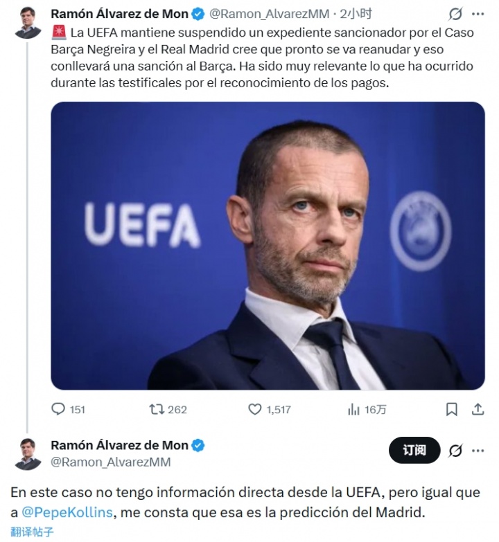 在此事上,我沒(méi)有來(lái)自歐足聯(lián)的直接消息來(lái)源,但和Pepe Kollins(西班牙足球評(píng)論員)一樣,我確認(rèn)這就是皇馬方面的預(yù)期。