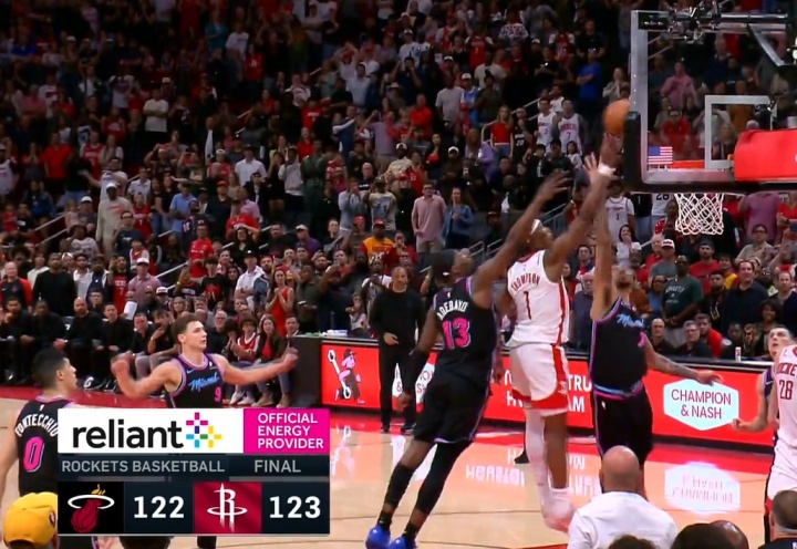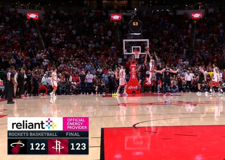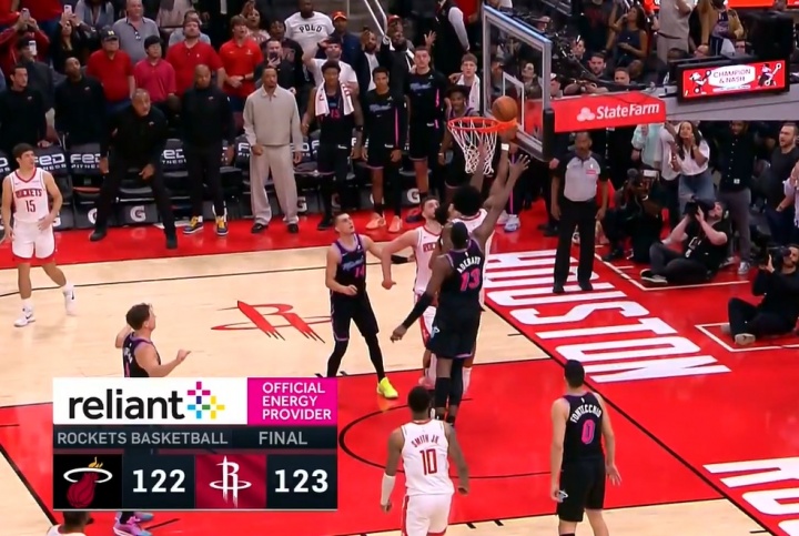 NBA常規(guī)賽,火箭123-122險勝熱火。