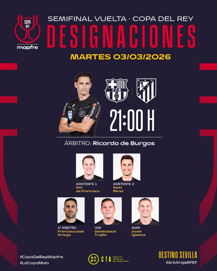 直播吧3月2日訊 北京時間3月4日凌晨4:00,國王杯半決賽次回合,巴薩將坐鎮(zhèn)主場迎戰(zhàn)馬德里競技。賽前,西班牙足協(xié)官方公布了本場比賽裁判安排,里卡多·德·布爾果斯執(zhí)法。