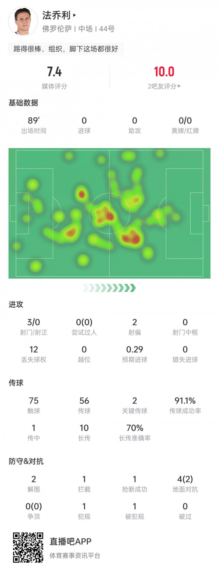 此役法喬利為佛羅倫薩首發(fā)出戰(zhàn),傳球成功率91.1%,送出2記關(guān)鍵傳球,當(dāng)選本場比賽最佳球員。
