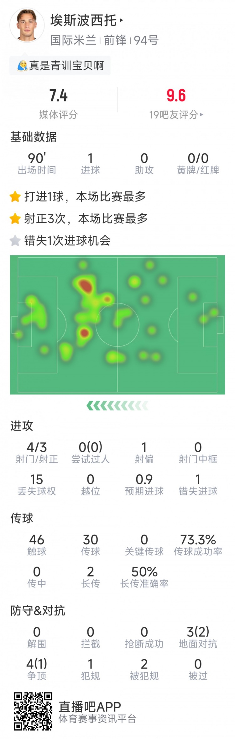 直播吧3月23日訊 在本輪意甲,國米1-1戰(zhàn)平佛羅倫薩。以下為埃斯波西托本場數(shù)據(jù):