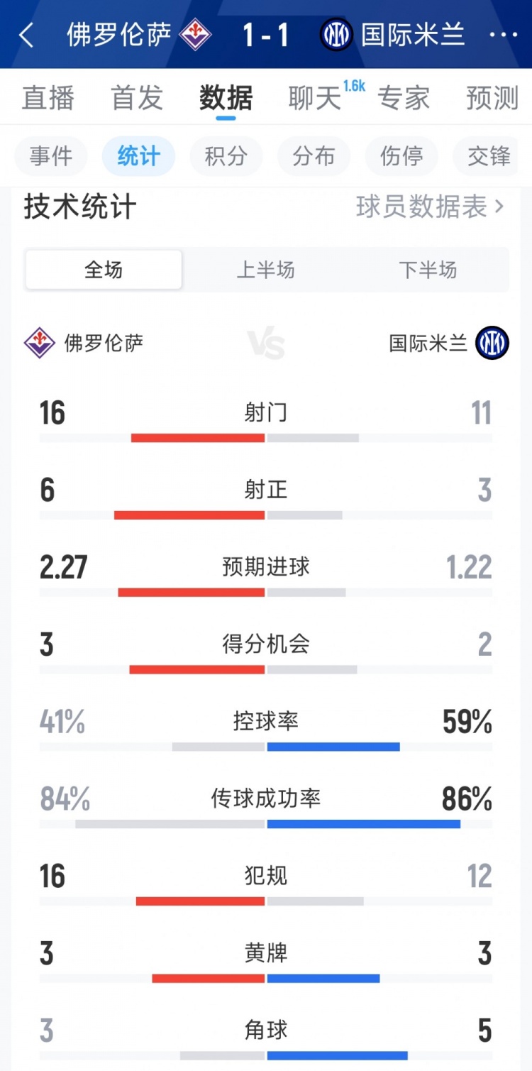 直播吧3月23日訊 在本輪意甲,國米1-1戰(zhàn)平佛羅倫薩,以下為雙方全場數(shù)據(jù)對比: