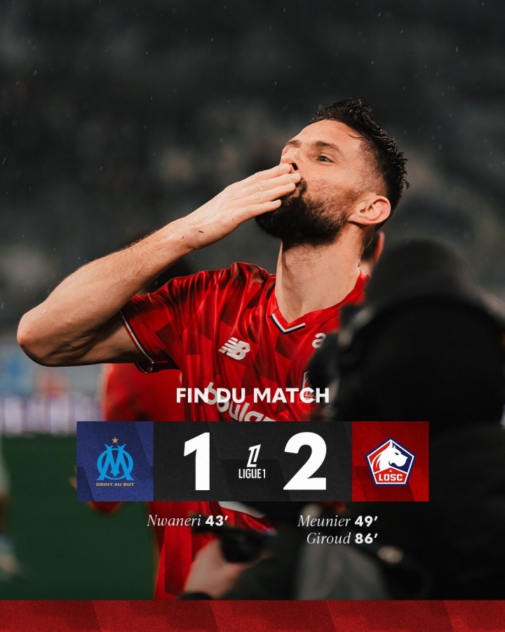 比賽尾聲,又是穆尼耶送出助攻,替補(bǔ)登場(chǎng)的39歲法國(guó)老將吉魯頭槌破門(mén),里爾在最后時(shí)刻反超比分!