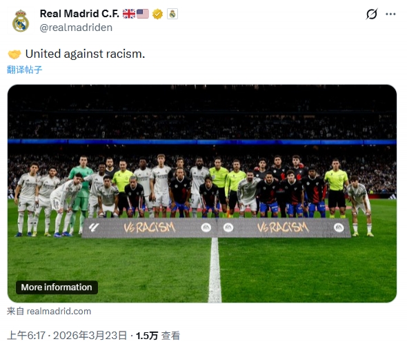 皇馬官推曬出賽前反種族歧視活動的合影,并配文:“團(tuán)結(jié)起來反對種族歧視?!?/p>
