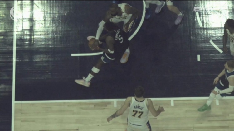 在比賽最后4.7秒的一次詹姆斯與班凱羅爭搶出界球權(quán)歸屬的判罰挑戰(zhàn)中,回放中心采用了鷹眼攝像機拍攝到的俯瞰視角畫面輔助判罰。