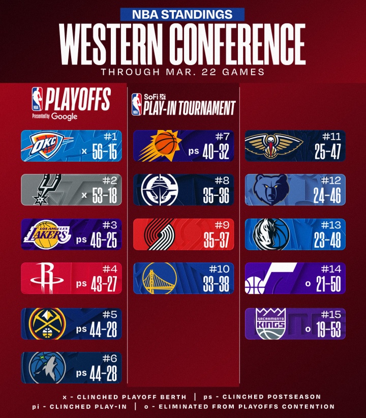 2.西部第五的掘金、第六的森林狼以及第七的太陽今日相繼贏球,其中掘金與森林狼的戰(zhàn)績(jī)繼續(xù)持平(同為44勝28負(fù),掘金因交手戰(zhàn)績(jī)占優(yōu)排名靠前)。