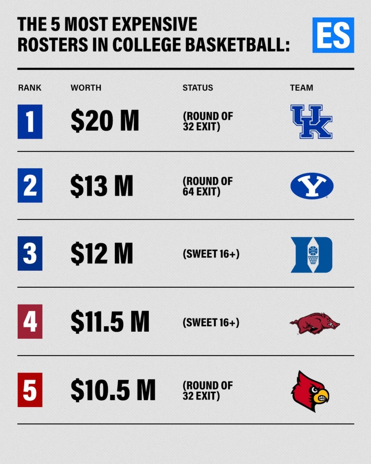 直播吧3月23日訊 美媒Essentially Sports報道,肯塔基大學(止步32強)本賽季陣容的NIL估值達到約2000萬美元,是目前NCAA投入最高的球隊之一。