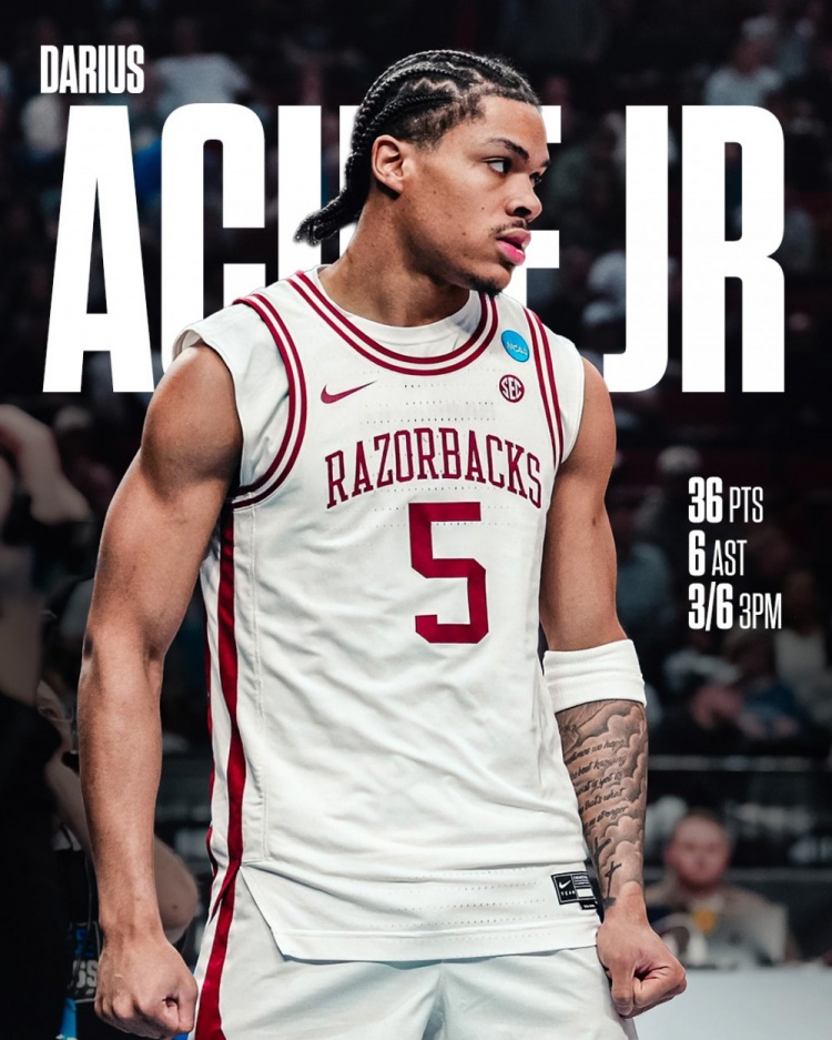 直播吧3月22日訊 NCAA瘋?cè)?2強(qiáng)賽,阿肯色大學(xué)94-88險(xiǎn)勝海波特大學(xué),晉級(jí)甜蜜16強(qiáng)。