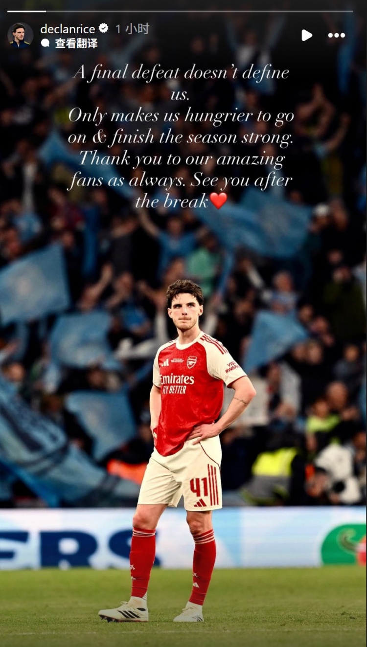 阿森納中場賴斯社媒曬出自己失落的照片,配文:“一場決賽的失利并不能定義我們。