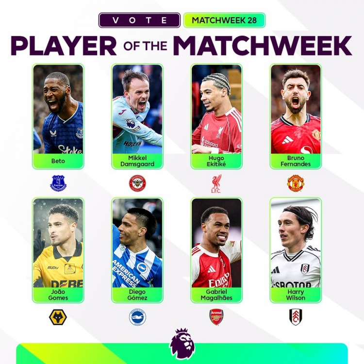 直播吧3月2日訊 英超官方公布聯(lián)賽第28輪最佳球員候選,埃基蒂克、B費、加布里埃爾等8名球員獲提名。