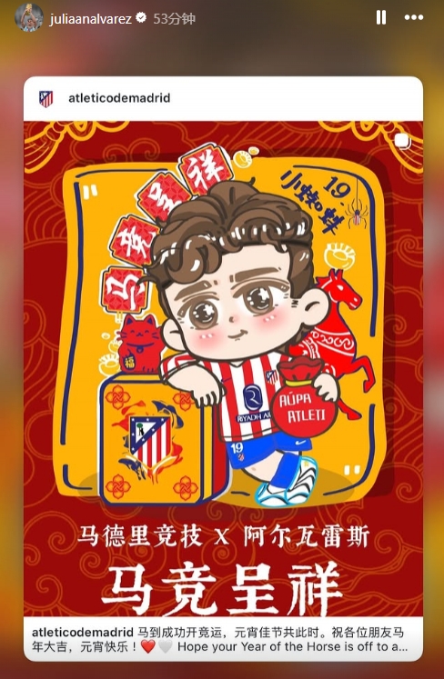 直播吧03月02日訊 今天迎來元宵節(jié),馬競官方社媒曬中文海報(bào)祝福,阿爾瓦雷斯也在個(gè)人社媒轉(zhuǎn)發(fā)。