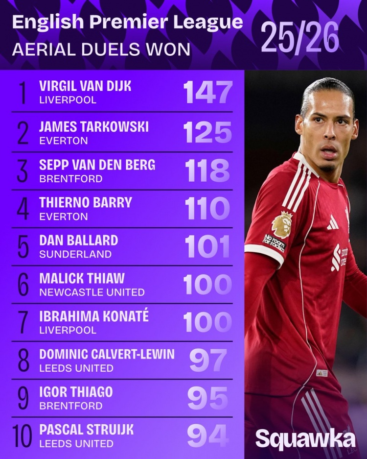直播吧3月24日訊 Squawka統(tǒng)計了本賽季球員在英超的爭頂成功次數(shù),并列出榜單,范戴克147次居首,并且他的成功率為75.77%,爭頂100+球員中最高。