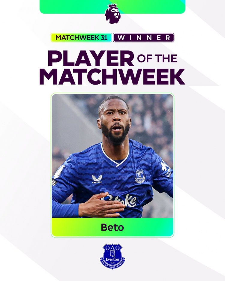 英超第31輪比賽,貝托2射1傳,幫助埃弗頓3-0擊敗切爾西,英超官方宣布,他當選上周最佳球員。